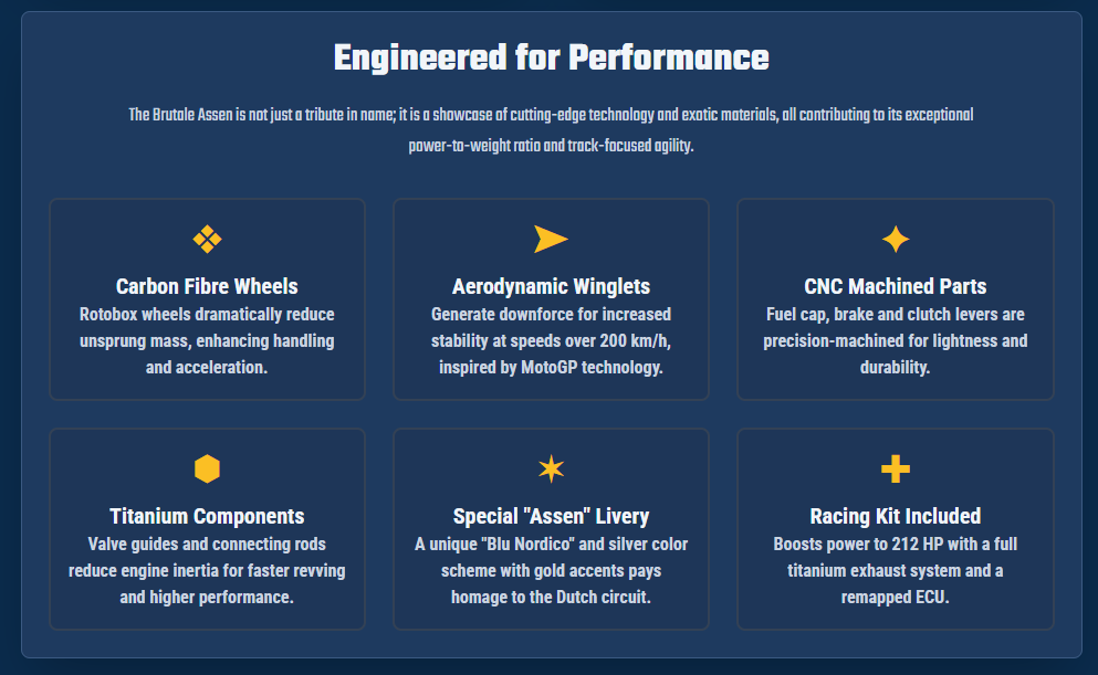 This report analyzes how MV Agusta has integrated its historical dominance at the “Cathedral of Speed” into the very fabric of this machine, from its core engineering to its exclusive design and performance profile. Every technical and aesthetic choice on the Brutale Assen serves as a direct consequence of this tribute, creating a vehicle that is as much a commemorative artifact as it is a modern-day hypernaked weapon.