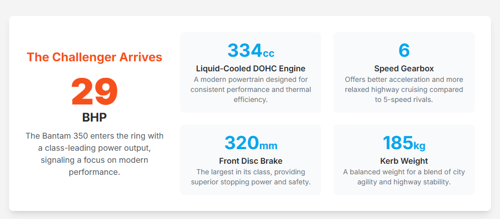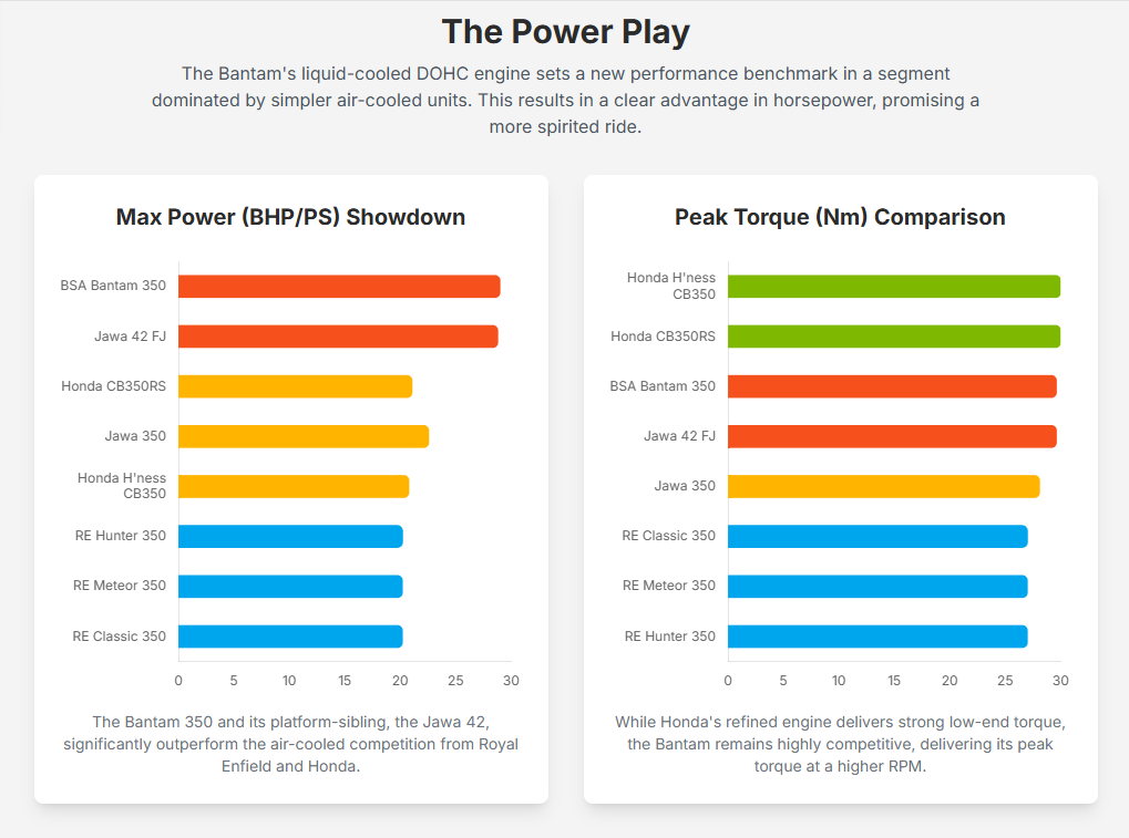The BSA Bantam 350 enters the market with a distinct performance proposition, primarily driven by its modern engine architecture. Its 334cc, liquid-cooled, DOHC engine produces 29 BHP at 7750 RPM and 29.62 Nm of torque at 6000 RPM.10 This places the Bantam 350 at a competitive edge in terms of peak power within the 350cc segment. Its platform siblings, the Jawa 350 and Jawa 42 FJ, share this same engine, though the Jawa 350 is reported with slightly lower figures of 22.57 PS and 28.1 Nm 17, while the Jawa 42 FJ matches the Bantam’s output.9