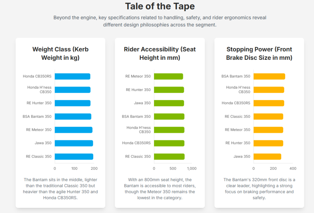 Kerb weight significantly influences a motorcycle’s handling and maneuverability. The BSA Bantam 350 weighs 185 kg 10, positioning it in the lighter half of the segment. The Royal Enfield Hunter 350 (181 kg) 14 and Honda H’ness CB350 (181 kg) / CB350RS (180 kg) 16 are the lightest, emphasizing agility. The Royal Enfield Meteor 350 (191 kg) 13, Jawa 350 (194 kg) 17, and Royal Enfield Classic 350 (195 kg) 12 are on the heavier side, typically offering more planted highway stability.