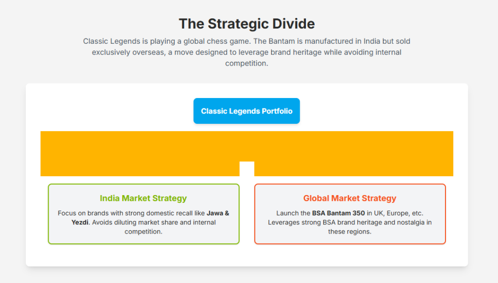 The decision to manufacture the Bantam 350 in India but launch it exclusively in overseas markets is a calculated strategic maneuver. This approach directly addresses the challenge of internal product cannibalization. Classic Legends already has a comprehensive portfolio of 350cc motorcycles under the Jawa and Yezdi brands in India, and introducing another model in the same displacement and price range could dilute their existing market share.5 By restricting the Bantam to international markets, Classic Legends avoids this direct competition within its own stable.