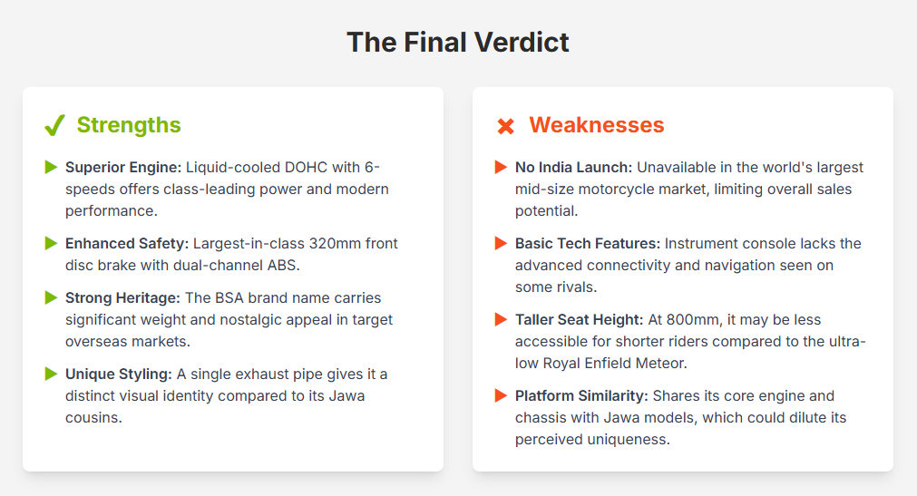 The BSA Bantam 350 enters the market with several notable strengths. Its modern liquid-cooled DOHC engine, shared with the Jawa 42 FJ, provides a higher power and torque output compared to many of its air/oil-cooled rivals, offering a more spirited and consistent performance, especially under varying conditions.10 The inclusion of a 6-speed gearbox and likely a slipper clutch further enhances its rideability and efficiency.10 From a safety perspective, the Bantam’s larger 320mm front disc brake, coupled with dual-channel ABS, suggests superior stopping power and a strong commitment to rider safety.10 Aesthetically, its distinct single exhaust pipe differentiates it from its twin-exhaust Jawa siblings, contributing to a unique visual identity.4 Critically, the strong British heritage of the BSA brand is a significant asset in its target overseas markets, providing an emotional connection that many competitors may lack.