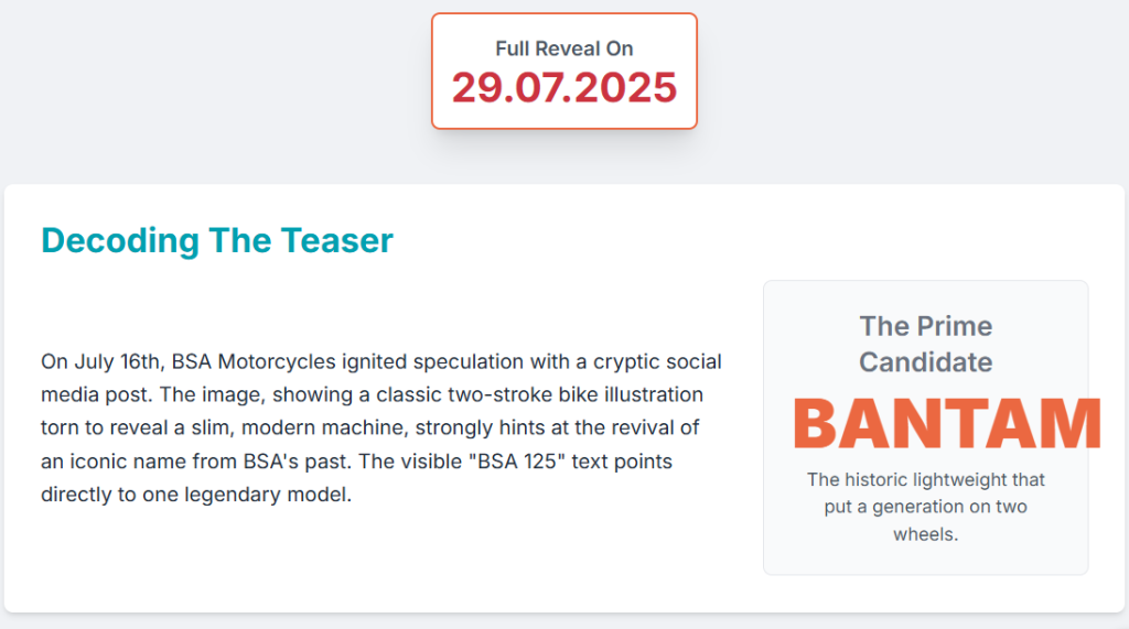 The analysis strongly indicates that the BSA Motorcycles teaser, “We’re going back to the future on 29.07.25,” points to the reintroduction of the iconic BSA Bantam. This strategic move aligns with BSA’s core philosophy of blending heritage with modern engineering and fills a critical market gap below its current 650cc offerings. The new Bantam is expected to be a four-stroke, single-cylinder motorcycle, likely utilizing Classic Legends’ existing 334cc or developing 450cc engine platforms, ensuring compliance with modern regulations and leveraging cross-brand efficiencies.