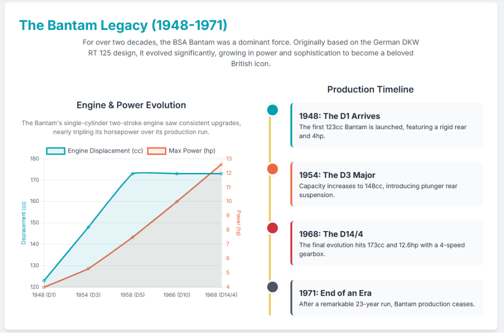 The original Bantam was powered by a single-cylinder two-stroke engine. Its displacement evolved over its production life, starting at 123cc for the D1, increasing to 148cc for the D3 Major, and further expanding to 173cc for the D5 and subsequent models.13 Correspondingly, the power output saw a progressive increase, from an initial 4 bhp to a peak of 12.6 bhp in later variants.13