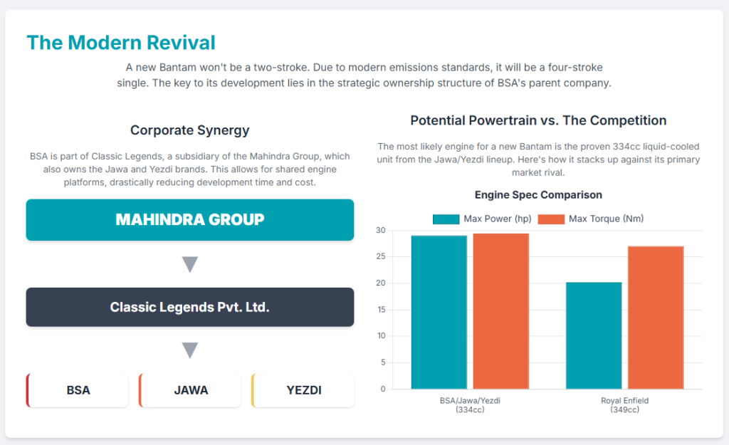 To successfully meet contemporary emission standards (such as Euro 5 or BS6) and to align with consumer expectations for reliability, smoothness, and fuel economy, a new Bantam must be powered by a 4-stroke engine. This is explicitly stated in the available information, noting that “any future Bantam clearly won’t be a two-stroke”.7 This fundamental shift represents a necessary departure from the original’s mechanical heart but is absolutely crucial for the commercial viability and widespread market acceptance of a new Bantam in the 21st century. The key challenge for BSA will be to meticulously design and engineer the new model in such a way that it retains the “spirit,” “character,” and nostalgic appeal of the original Bantam, despite this significant underlying mechanical change. Four-stroke engines inherently offer superior fuel efficiency, significantly lower emissions, smoother operational characteristics, and generally greater durability, making them the undisputed industry standard for modern passenger vehicles and motorcycles.18