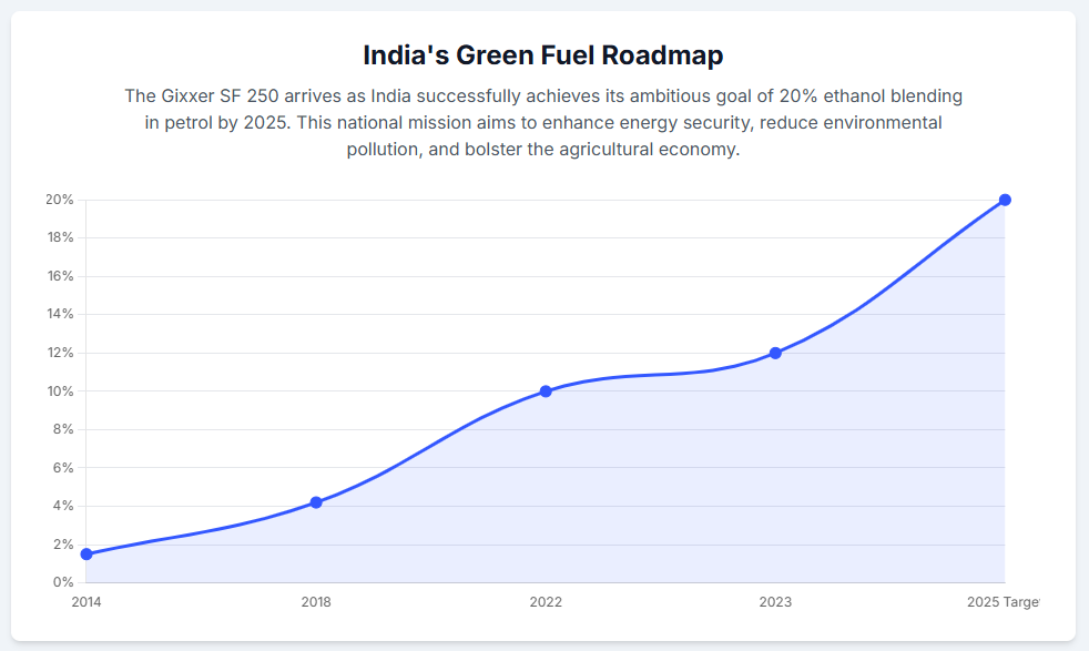 India, recognized as the world’s largest two-wheeler market 6, serves as the strategic operational hub for the Gixxer FFV debut. This deployment is driven by aggressive national blending mandates aimed at securing energy independence, reducing the crude oil import bill, and lowering atmospheric carbon emissions.7