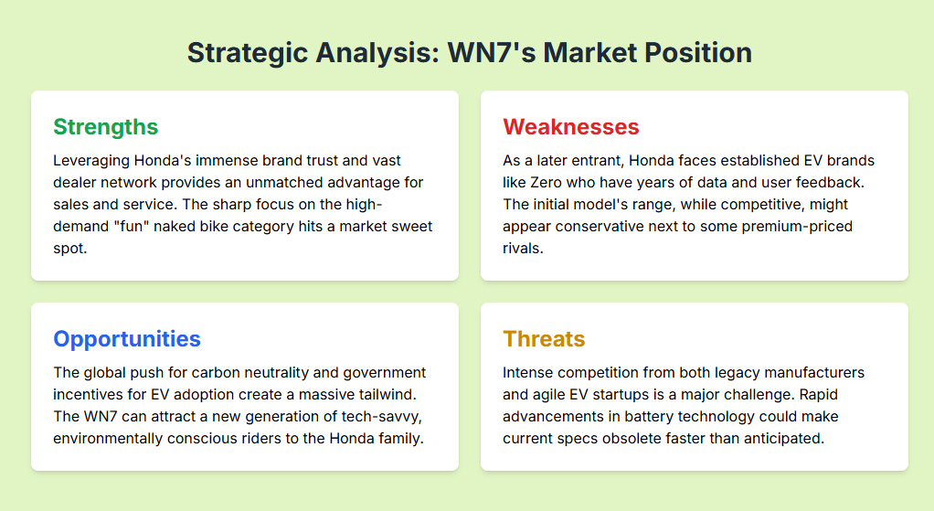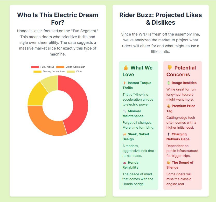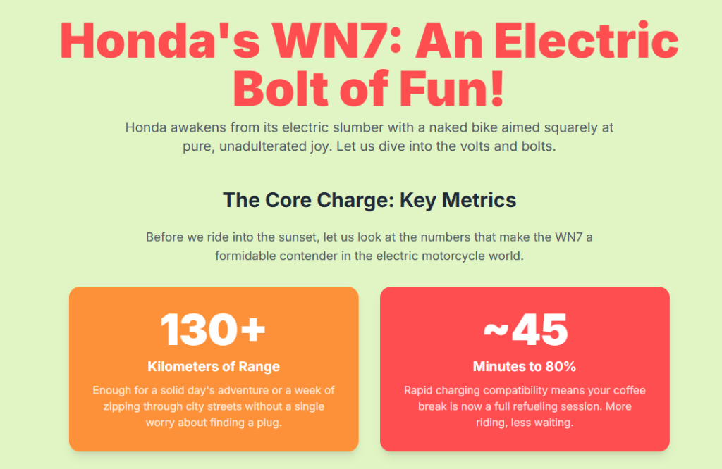 To maximize the WN7’s commercial success, Honda must immediately reframe its marketing message to accentuate its key advantages, rather than defend its limited range. The company should strategically cease marketing based on the raw 130 km range figure and focus entirely on the convenience of CCS2 charging and the thrill of 100 Nm of torque. The core communication must shift to: “The WN7 delivers liter-bike fun and recharges faster than your lunch break.”