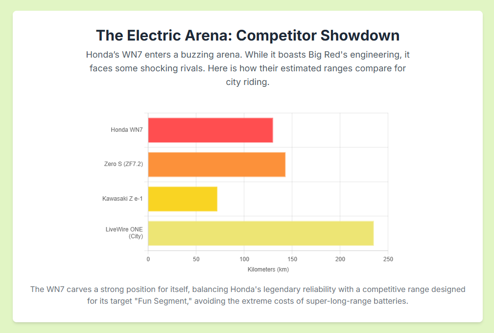 Furthermore, the Honda’s peak 67 hp is substantially lower than its premium-priced rivals, which generally offer outputs of 101 hp to 110 hp.9 To compound the issue, the WN7’s 217 kg weight is remarkably close to the heavier, yet longer-range, rivals 2, underscoring its comparatively poorer power-to-weight ratio and limited energy efficiency.