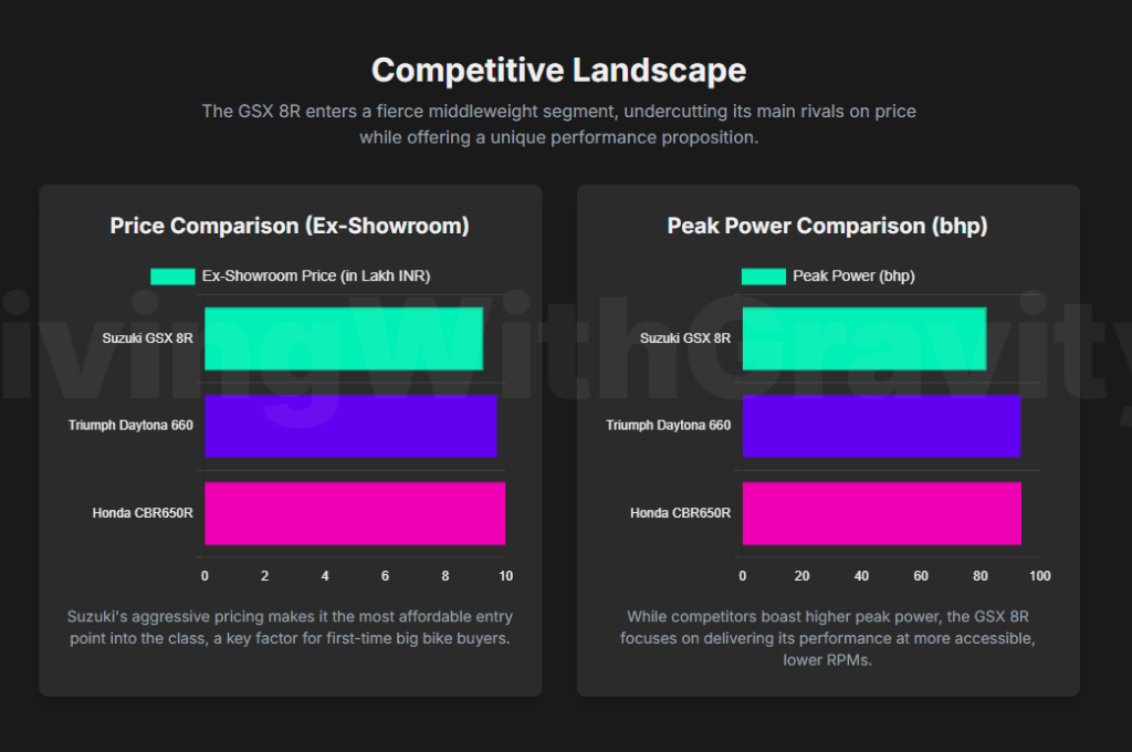 The Suzuki GSX 8R is positioned directly within the highly competitive middleweight sports tourer segment, where its primary rivals include the Honda CBR650R and the Triumph Daytona 660.1