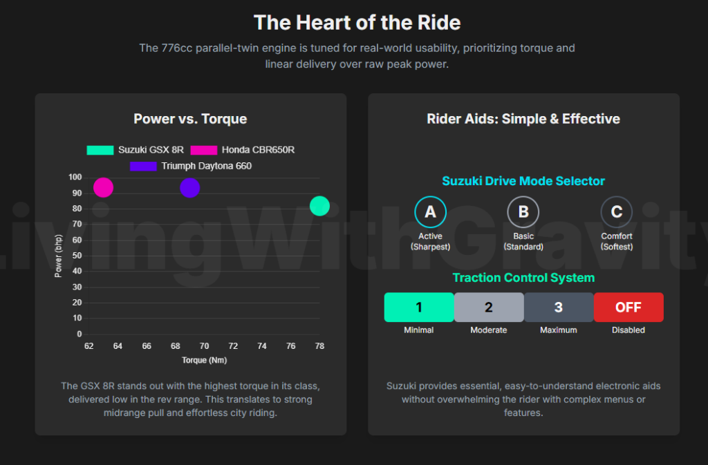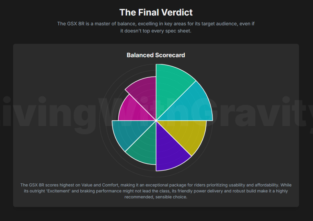 The consequence of this approach is a motorcycle is more accessible and less intimidating for its target audience of “first big bike” buyers. This implies the GSX 8R is not attempting to out-spec its rivals on every single front. Instead, it aims to carve out a distinct niche as the most approachable, practical, and value-for-money option within its segment. Its “understated” nature 3 serves as a deliberate differentiator, appealing specifically to those who prioritize manageability and reliability over overt sportiness or a comprehensive checklist of advanced features.