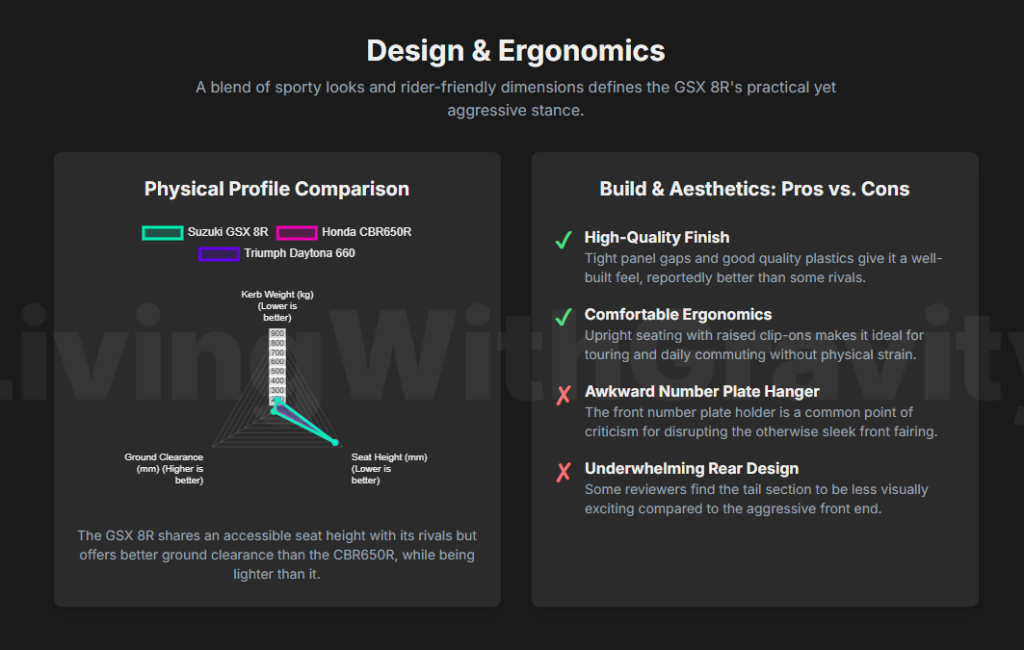 While largely praised, the design does have a few minor criticisms. Some observers have pointed out a “weird-looking” front number plate hanger 1 and a subjective feeling a black element near the seat appears somewhat out of place, with a preference for a single, solid color scheme.4 The rear-end design has also been described by one reviewer as “a little underwhelming”.4 The initial description of the GSX 8R highlights a “racy design” but immediately emphasizes its “upright seating ergonomics”. Subsequent evaluations further detail the motorcycle’s comfort and neutral riding position.4