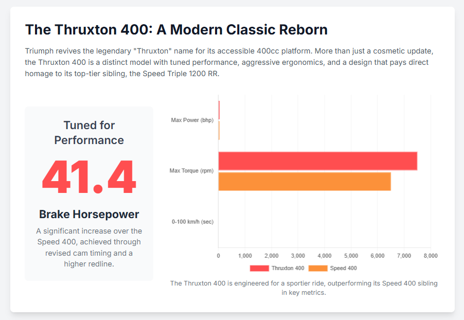 The Thruxton 400 is more than a style-first model; it features notable performance and technical enhancements that differentiate it from the Speed 400. While it is powered by the same 398 cc, liquid-cooled, single-cylinder TR-Series engine, this version has been “tuned for more performance,” particularly in the top-end of the powerband.2 The mechanical modifications include a revised cam timing and a rear sprocket with two fewer teeth, which, combined with a raised redline from 9,200 to 10,200 rpm, results in a more high-revving character.5