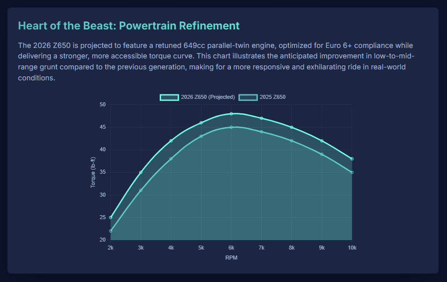 The platform continues to be powered by the highly regarded 649cc liquid-cooled parallel-twin engine.1 The engine is configured to produce a maximum power output of 50.2 kW {68 PS} (67.10 hp) at 8,000 rpm. Maximum torque is rated at approximately 64 Nm or 65.7 Nm (47.2 to 48.5 lb-ft), delivered efficiently between 6,700 and 7,000 rpm.2 This engine calibration prioritizes accessible power and response in the low-to-mid speed ranges, making the Z650 exceptionally versatile for both city commuting and spirited mountain road riding.1