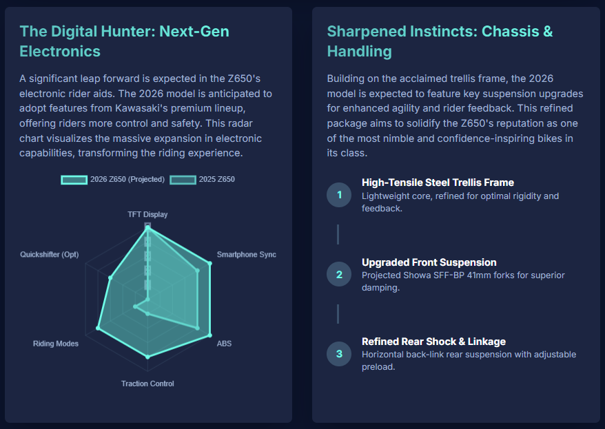 Standardizing advanced electronic rider aids is central to the 2026 Z650 update, ensuring the platform remains highly relevant and competitive in a segment increasingly defined by technology.