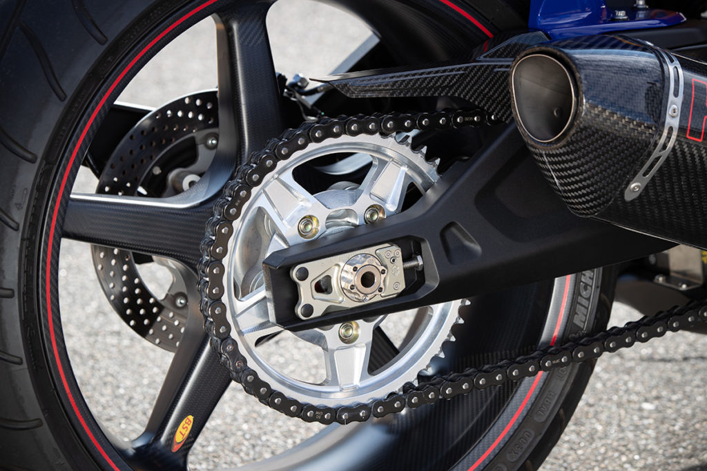 - 19 ” front and 18 ” rear carbon fiber wheels that get lighter due to carbon fiber and that makes the bike easy to handle.