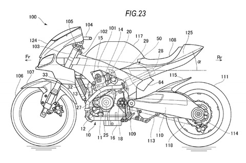 First round of patent surfaces in March 2016. Similar to the concept model, it has an aluminum twin spar frame. The engine is SOHC having one camshaft working both the intake and exhaust valves.