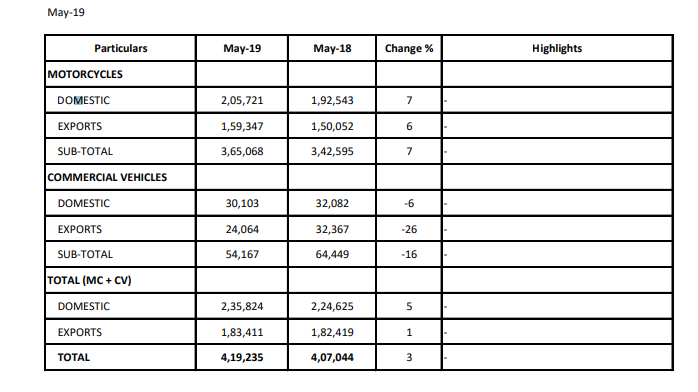 Sales of Bajaj Motorcycles has increased 3% compared to sales in May 2019 compared with May 2019. The no of units sold were 3,42,595 in May 2018 compared to 3,65,068 units in May 2019 which is more 22,473 units.