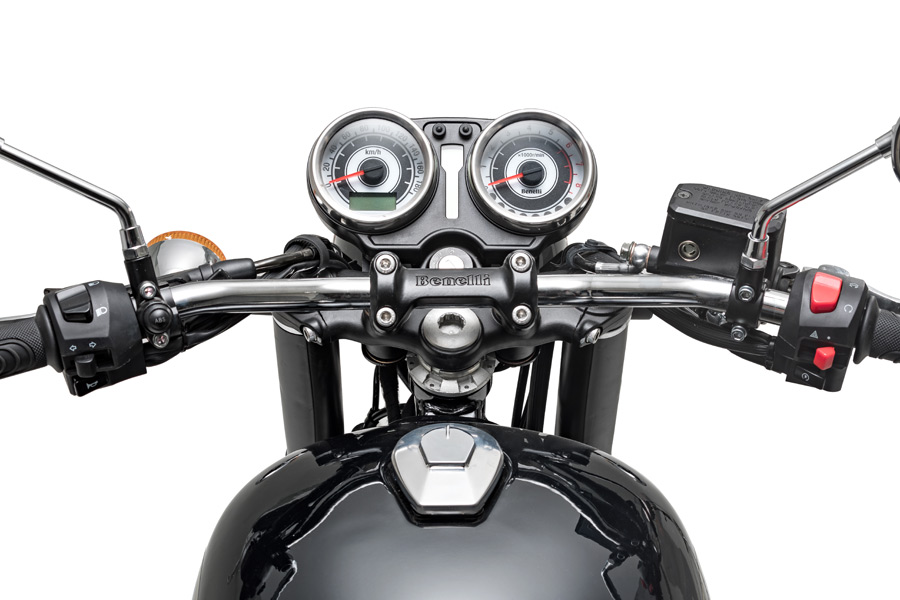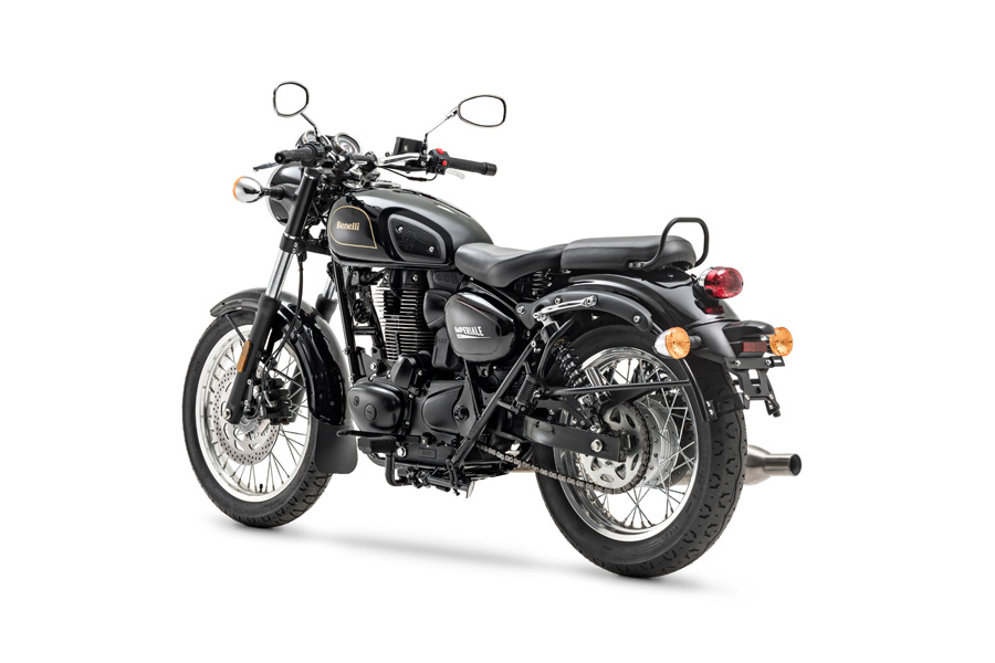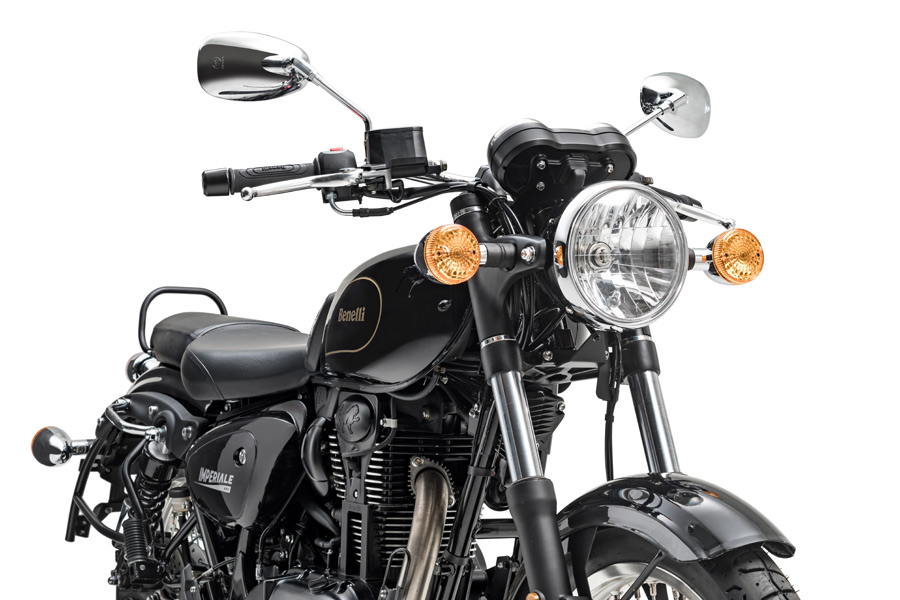 Extremely easy to ride and handle, the Imperiale 400 has a compact and durable double cradle frame made of steel tubes and plates. The front suspension features a telescopic fork with legs having a 41 mm diameter and 110 mm travel, while the rear has a swinging arm with double shock absorber and travel of 65 mm. The design of the exhaust and the chrome inserts accentuate the vintage style of this new Benelli motorcycle, reinforced by the round front headlight – typically retro – and the teardrop tank, which bring out the motorcycle’s true essence.
