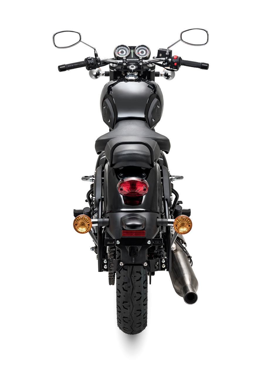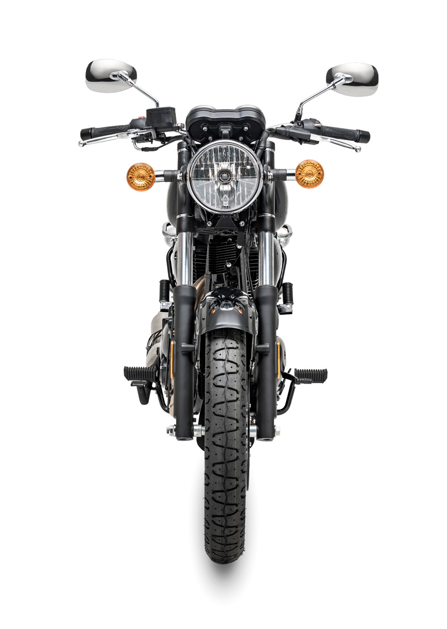 The effective and balanced braking system of the Imperiale 400 features a 300 mm diameter disc on the front with two-piston floating calliper and a 240 mm disc with single-piston calliper at the rear, thus ensuring full control of the bike. The aluminium alloy rims have different diameters: 19″ on the front end, 18″ on the back, respectively mounting 110/90 and 130/80 tyres.