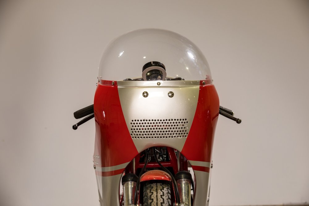 The fiberglass body was a gem in its very own right, the fairing clearly had no space for the headlights yet had just a couple of gaps. Behind the front wheel, the fairing is for the most part open to permit the best conceivable cooling of the two-chamber, and there is a little windscreen made of Perspex to enable the pilot to squat on the straights.