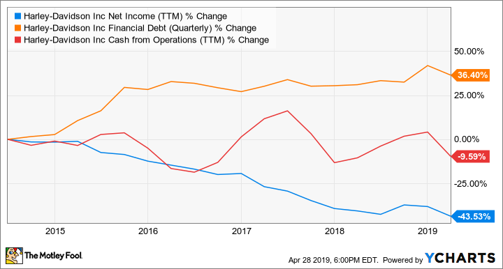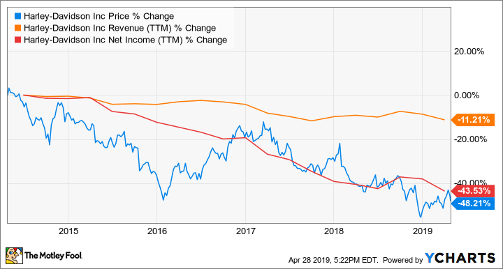 According to data released by the company, in the first quarter 2019 the motorcycle shipments fell 7.9% to 58,891.During the last five years, revenue had gone down by 11.2% and net income has again gone down by 43.5%.