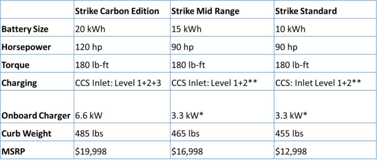 Strike comes standard with Level 1 and Level 2 charging capability with Level 3 DC fast charging as a $1,500 option. Standard onboard charger is rated at 3.3 kW with an optional 6.6 kW onboard charger available for $1,500.