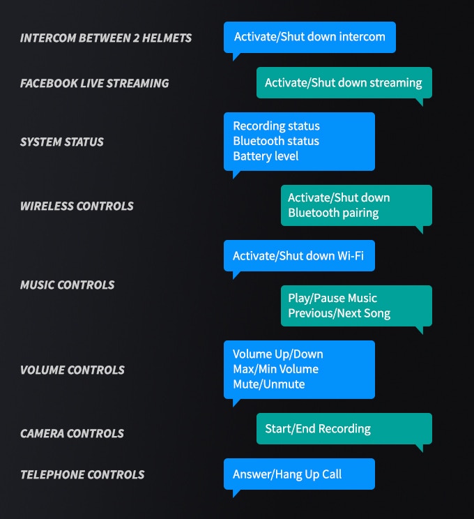 Journeys can be recorded in FHD video via the built-in front 2K camera and stored on [removable] 16GB (optional up to 256GB) memory cards in the helmet. The video can also be broadcast in real-time to user’s social media account by voice command, while the app lets users download footage to their smartphone and personal cloud server.