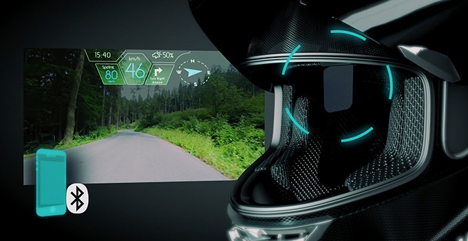 The X-AR helmet has the ability to display directions, and notify the wearer of traffic and weather conditions, indicators, speed, hazard road signs and incoming caller IDs on the HUD. It even shows 2K rear-view images so the rider has 360° visibility while on the road.