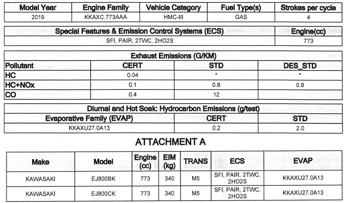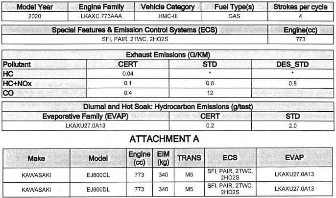 Documents of W800 of 2020 model filed in May 2019. As mentioned above, the value of the exhaust remains as is. They are EJ800CL and EJ800DL.