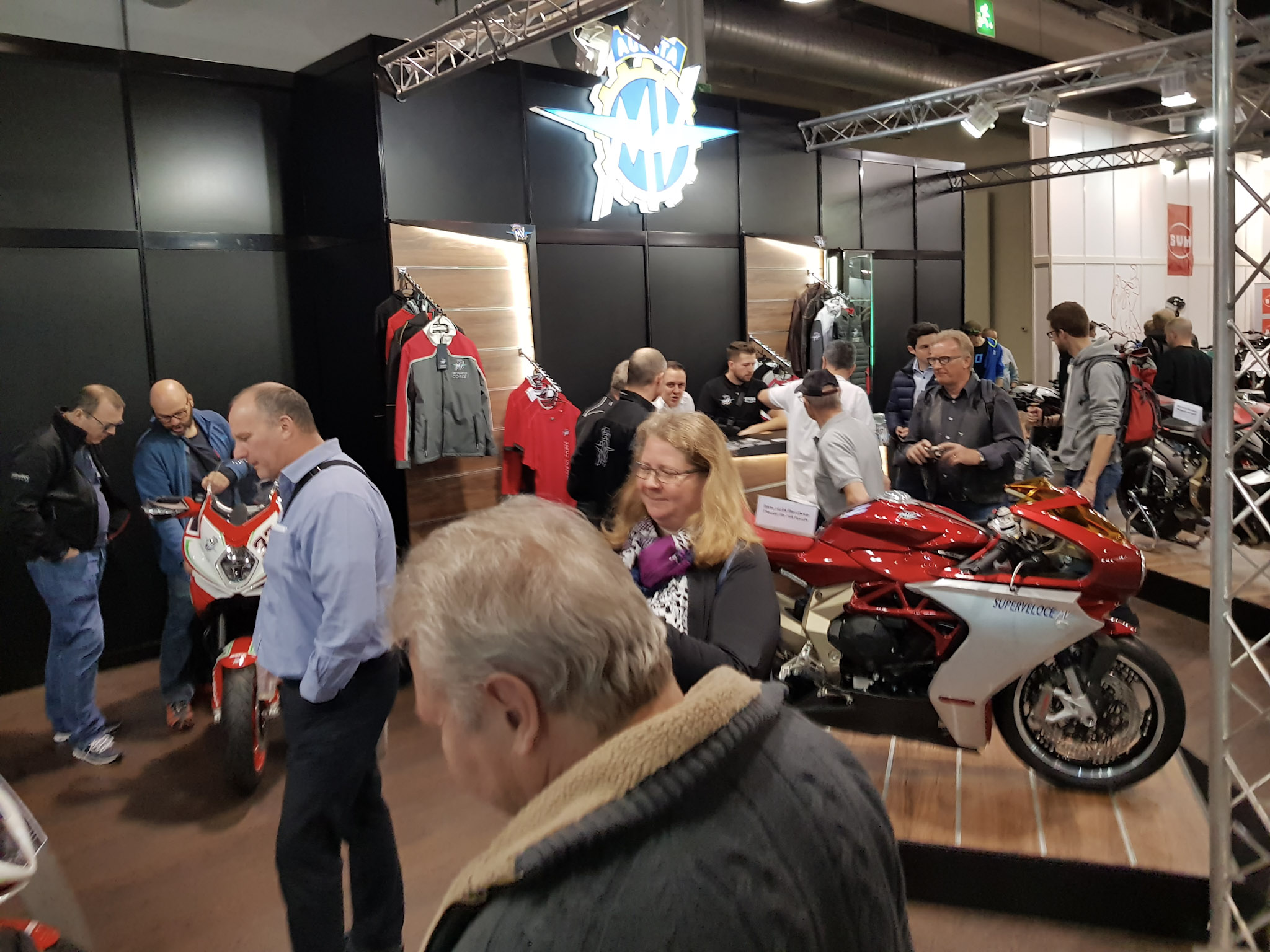 A large number of visitors (+ 10%) to the two motorshows.For the first time the range was presented fully with the new Corporate Identity.Among the bikes dispalyed: MV Agusta Brutale 1000 Serie Oro, the Superveloce, the Brutale 800 also in the 35kW version and the RR series, the F3 800 with also in the RC version.In addition to the motorcycles, visitors could also admire the MV Agusta merchandising.