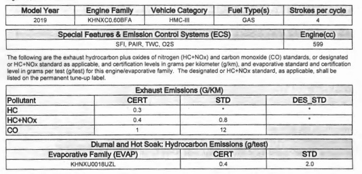 If you compare both the CARB documents of year 2018 and 2019.The exhaust gas values are the same. So there is no change except color. I feel like that in the US as it is in the 2019 model.