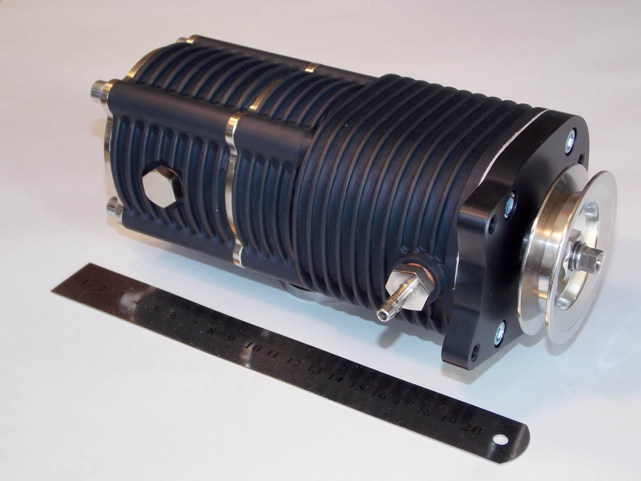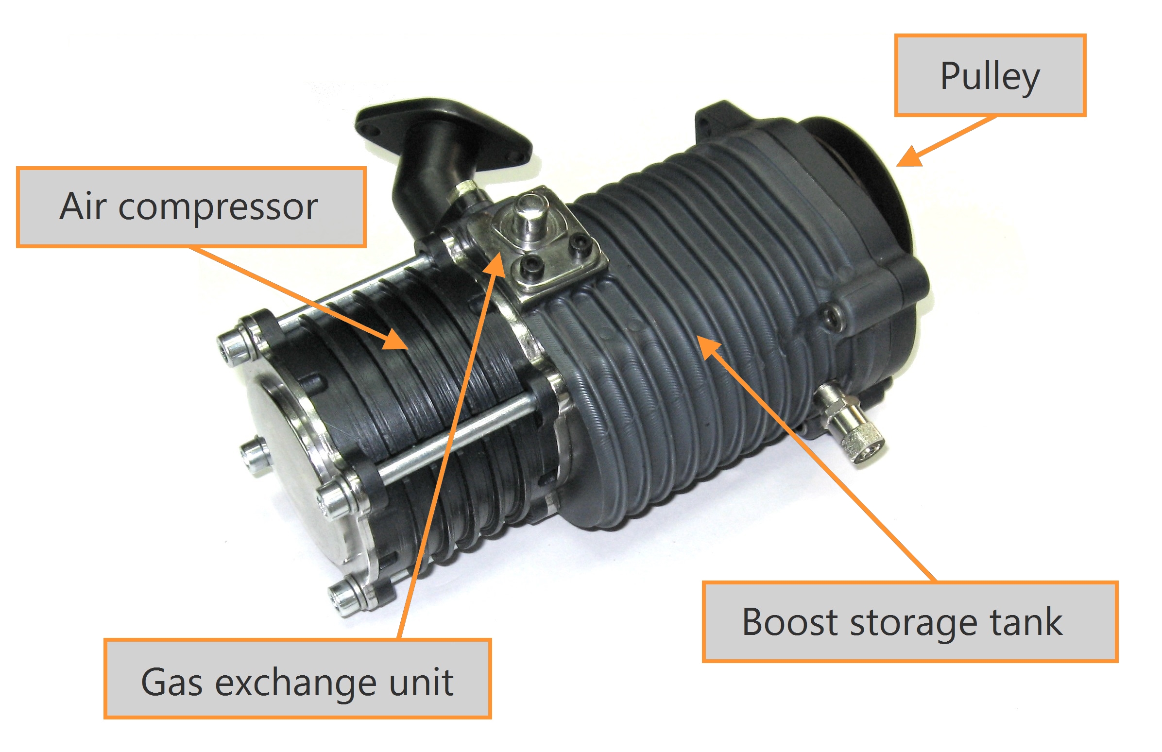 Our supercharger consists of 4 main units: (a) air compressor, (b) boost storage tank, (c) gas exchange unit, and (d) drive pulley.