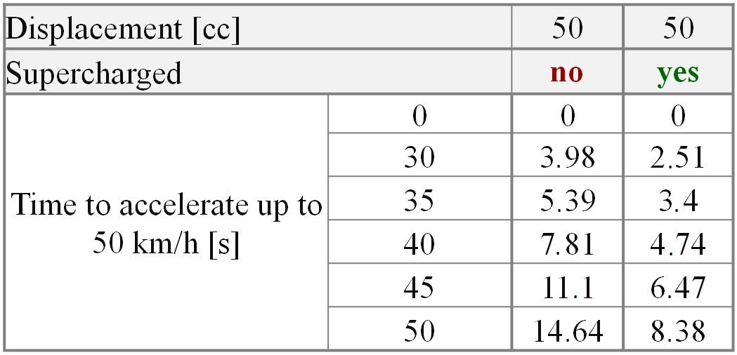 As the diagram shows, the 50cc supercharged motorbike has an acceleration time of 8.5 seconds to reach 50 km/h speed.  The stock model reaches the same speed in 14.5 seconds.  Thus the time to reach maximum allowed speed for supercharged motorbike is less than that of the naturally aspirated stock motorbike by 40%.  The target bike technical specification allows 50 km/h limit.