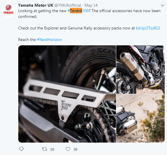 Twitter account of official Yamaha UK also talks about accessories have been confirmed for upcoming Tenere 700.