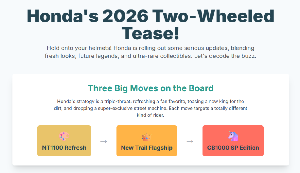 The 2026 model year announcements from Honda reveal a meticulously calculated strategic roadmap designed to reinforce existing strengths while paving the way for aggressive growth in emerging segments. This is a masterclass in product management, executed through a dynamic three-pronged approach: Sustained Dominance in touring with the subtly updated NT1100, Halo Elevation for the streetfighter segment through the hyper-exclusive CB1000 Hornet SP 5Four, and Base Consolidation in the off-road sector with the confirmation of a new flagship trail bike.1