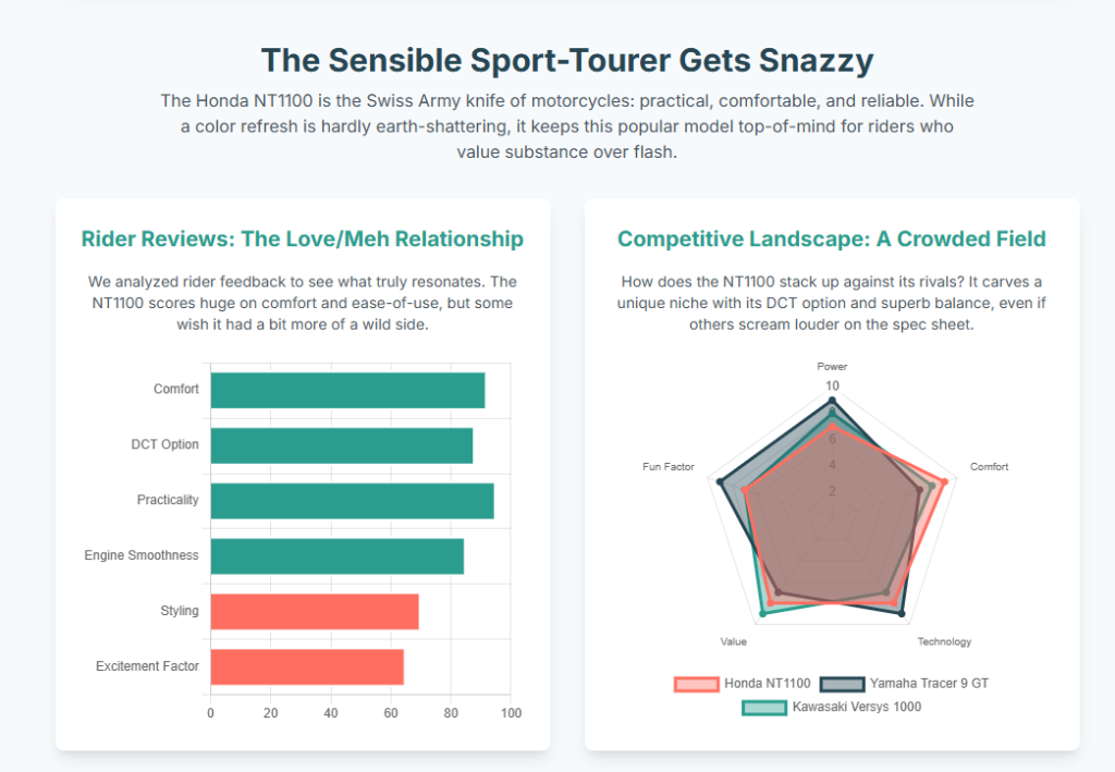 This comparative view clearly demonstrates that Honda’s dominance is not solely tied to raw engine output but to the deliberate combination of a unique, rider-friendly transmission technology (DCT) and the inclusion of highly sought-after touring necessities as standard equipment. This ensures the NT1100 provides the “most bang for buck” option for serious distance riders.10