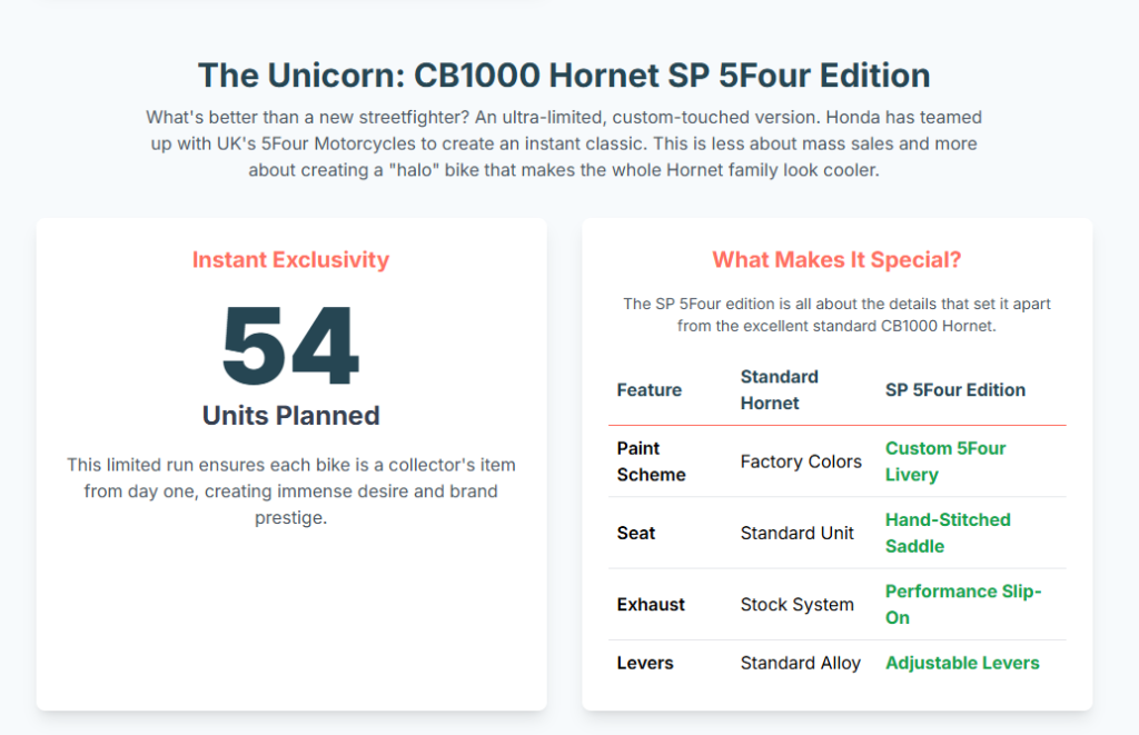 The CB1000 Hornet SP 5Four collaboration is a brilliant application of the ‘halo effect.’ By producing only 54 units with the artisanal touch of Guy Willison, Honda creates immediate collector value and intense media buzz.3 This exclusivity elevates the perceived status of the entire CB1000 Hornet SP line, a hypernaked machine praised for offering serious performance and great value at a price point that undercuts its immediate Japanese rivals. The fact that the bike is unapologetically a solo-rider machine, with a famously uncomfortable passenger seat, further confirms its focus on raw, dedicated street performance.