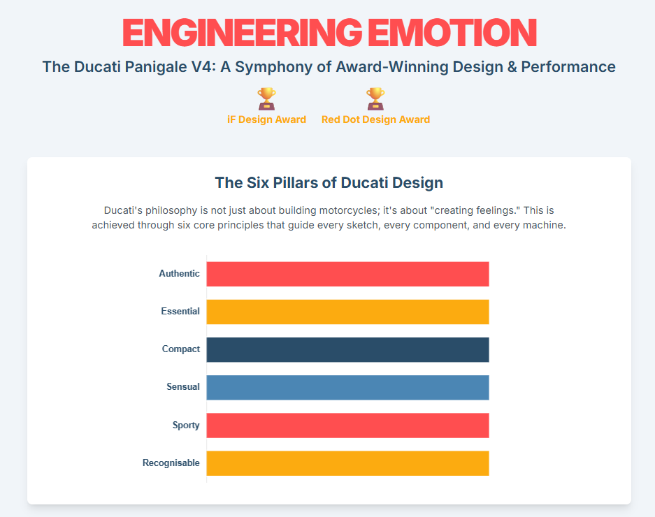 Ducati’s design philosophy is profoundly centered on “creating feelings,” a comprehensive approach that meticulously guides every aspect of their product development.4 This philosophy is manifested through six core pillars that define the essence of a Ducati motorcycle: