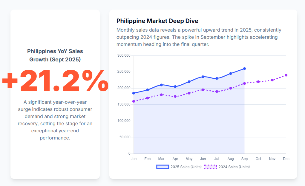 The central thesis of this report is that the observable sales momentum in the Philippines (PH) is driven by powerful, sustainable structural demand, firmly supported by a highly accommodating consumer financing ecosystem. This dynamic resulted in exceptional Q3 performance, highlighted by a staggering 21.2% year-over-year (YoY) growth in September.1 Conversely, the anticipated strong finish in Thailand (TH) is predicated primarily upon cyclical factors, namely short-term government fiscal stimulus measures and the temporary relaxation of restrictive lending criteria.2