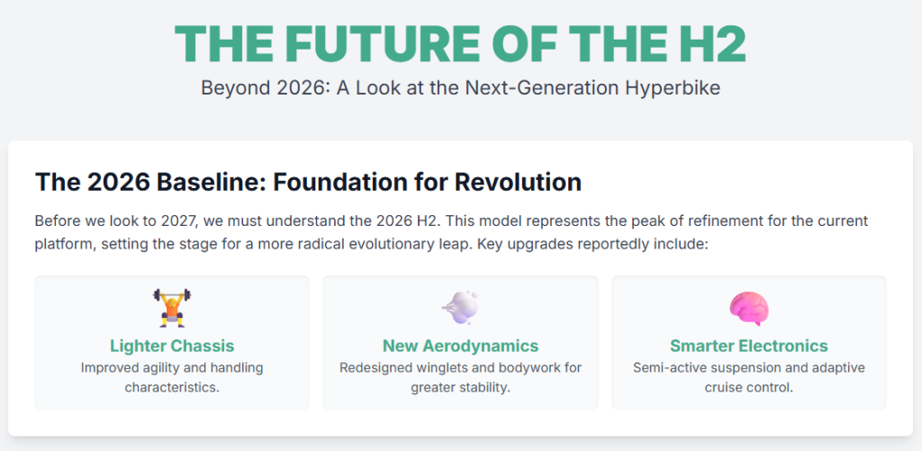 The 2027 H2 is thus not merely a new model, but a critical transitional platform. It is designed to act as the flagship demonstration of the SHEV technology, ensuring the legendary “Fun to Ride” philosophy is retained while adhering to the most stringent global standards. By adopting advanced fuel systems and potentially fortified internal components for the SHEV, the platform simultaneously serves as a high-performance testbed, proving components that could be adapted for future hydrogen or e-fuel variants, bridging the technology gap to the early 2030s carbon-neutral goals.15
