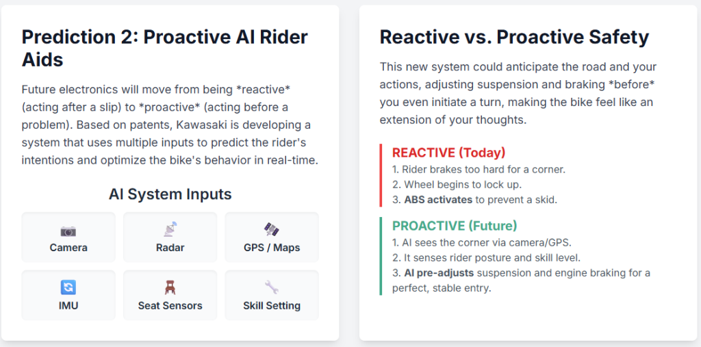 These extreme performance metrics mandate concomitant advances in chassis dynamics. The H2 Gen 2.0 will introduce radical weight offset measures through Hybrid Chassis Materials, integrating Additive Manufacturing (3D-printed steel nodes) to ensure the mass increase from the battery and motor does not compromise handling. Furthermore, sophisticated AI-Powered Predictive Dynamics, including Adaptive Aerodynamics and ML-supported semi-active suspension, will move the motorcycle from reactive assistance to anticipatory control, crucial for safely managing the immense power output and maintaining stability at hyperspeeds.