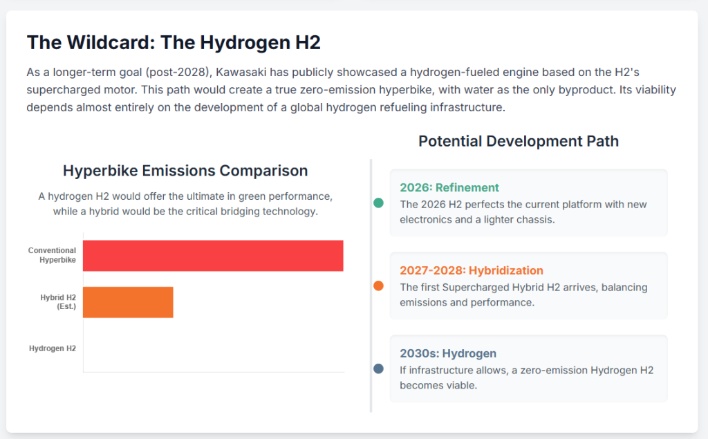 The confirmation of the core S-ICE architecture continuing through the 2026 model year strongly implies that KHI is preparing for a major generational discontinuity. Developing a vehicle of the H2’s complexity, particularly one integrating a performance hybrid system, requires several years of R&D and validation. The sustained production of the Gen 1.0 platform indicates that the 2027 or 2028 model release is strategically timed to debut a comprehensively redesigned Gen 2.0. This timing aligns with the maturation and commercialization of Kawasaki’s hybrid technology, which the company has publicly committed to expanding by 2025.7