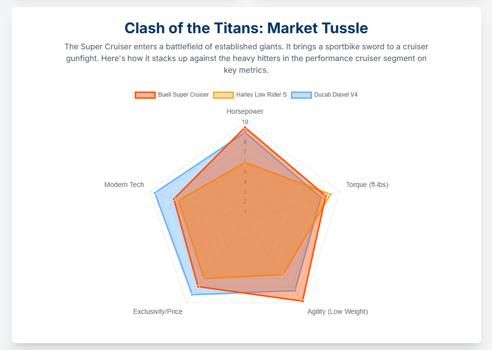 superbike cruiser sub-segment, ensuring the Super Cruiser competes effectively on dynamic handling and acceleration metrics, forcing legacy cruiser manufacturers who prioritize sheer weight and low-end thump into an unfavorable performance comparison focused purely on agility.