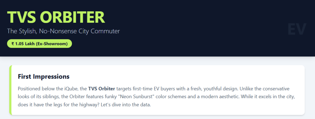 - TVS Orbiter First Ride Review: Orbit Commuter – Car and Bike, accessed January 28, 2026, https://www.carandbike.com/reviews/tvs-orbiter-first-ride-review-orbit-commuter-3218395