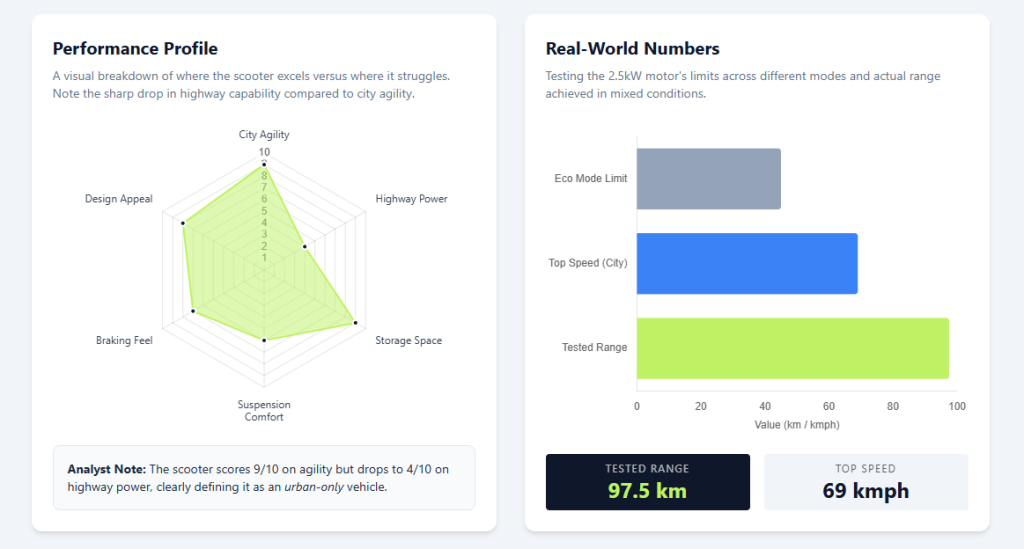 An underlying insight from automotive reviewers is that this performance envelope is specifically tuned for first-time riders. The “sedate” power delivery ensures that novice riders or teenagers with learners’ permits are unlikely to lose control due to sudden power surges, making it a “safer” choice for households transitioning to electric mobility.16