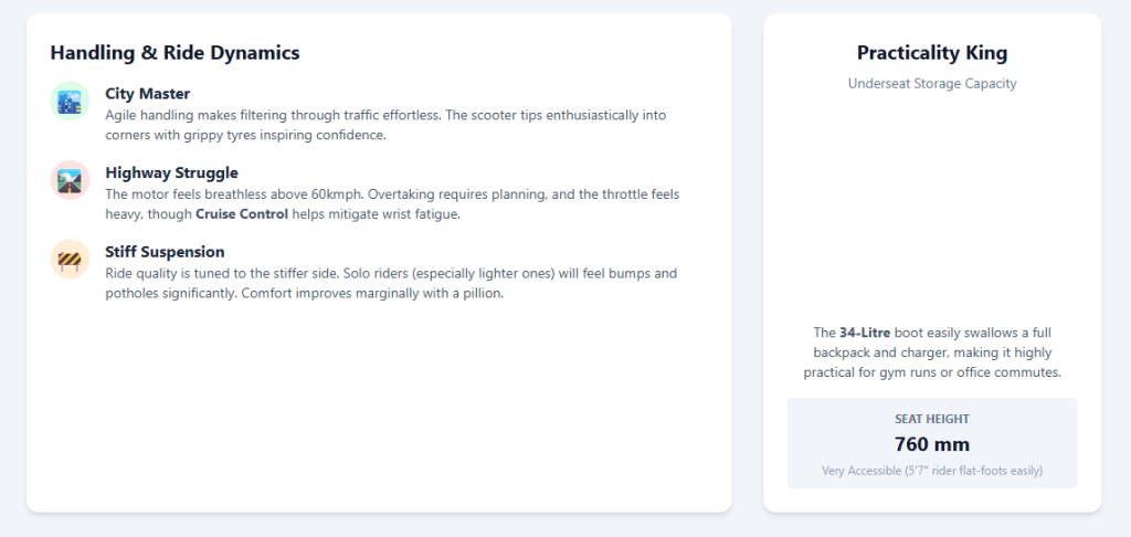 Compared to the base iQube, which is roughly 2.5 seconds faster in the 0-40 km/h sprint, the Orbiter feels subdued.3 This makes it more suitable for filtering through arterial city roads than for high-speed highway travel.3 However, the throttle calibration is lauded for its precision, providing a smooth transition that mimics the feel of a traditional internal combustion engine (ICE) scooter, thereby reducing the “jerkiness” often found in budget electric controllers.3