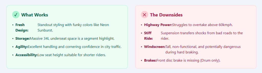 - Industry Consensus: Reviewers have consistently noted that the lack of a front disc brake is a major safety miss, as it reduces the “bite” and confidence-inspiring stopping power required for emergency situations in urban traffic.3