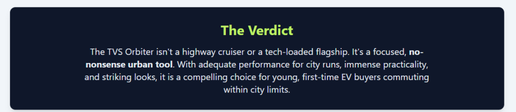 - TVS Orbiter First Ride Review – Impressive Range, Looks Great, But.., accessed January 28, 2026, https://ackodrive.com/reviews/tvs-orbiter-first-ride-review-impressive-range-looks-great-but/