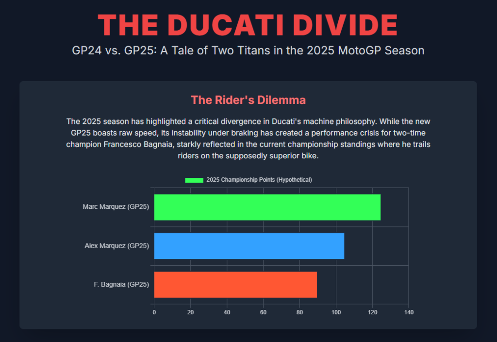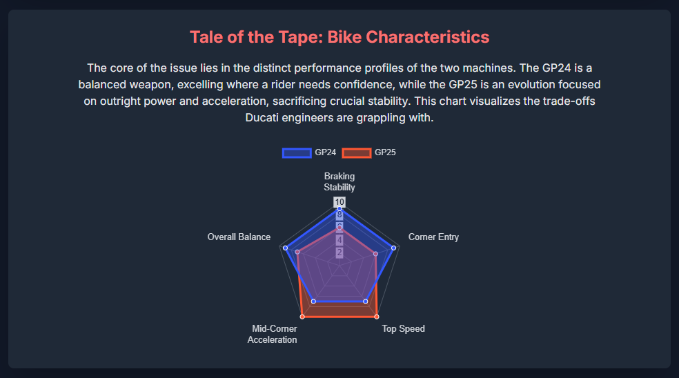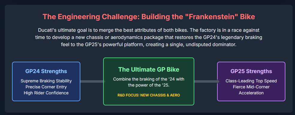 The GP24/GP25 divide represents a high-stakes, mid-season technical diagnostic and correction effort for Ducati Corse. The forward strategy must be meticulously managed under the constraints of homologation rules while seeking to restore confidence for all factory riders.