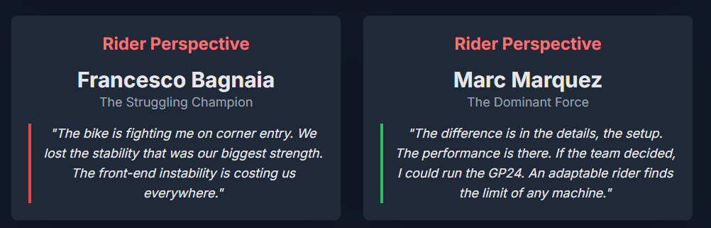 The disparity in technical adaptation has created a potent competitive dynamic known as the “Marquez effect”.8 Marquez’s ability to dominate on a bike that the reigning champion finds volatile generates significant external and internal pressure on Bagnaia. The observed change in Bagnaia’s body language—appearing “more stiff on the bike” 8—is a common symptom of a rider battling a loss of confidence. This tension directly hinders the free flow required for optimal performance, manifesting as slower reaction times and less precise handling in high-stakes environments, thereby amplifying the inherent mechanical inconsistencies of the GP25 hybrid.