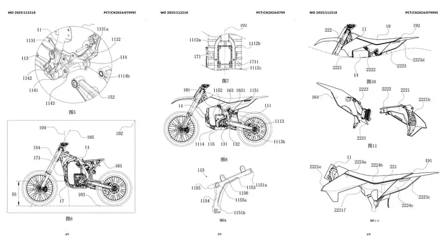 The CF-X first made a brief appearance at EICMA, presented as an “unmistakably an EV off-roader” with no accompanying details or press images, deliberately building anticipation. Subsequent patent applications, despite a generic “Motorcycle” title, definitively reveal CFMoto’s electric dirt bike through detailed drawings and an abstract outlining its core components: “a frame, a body covering member, a traveling system, a power assembly, a traction battery, a saddle system, and a heat dissipation system”.7